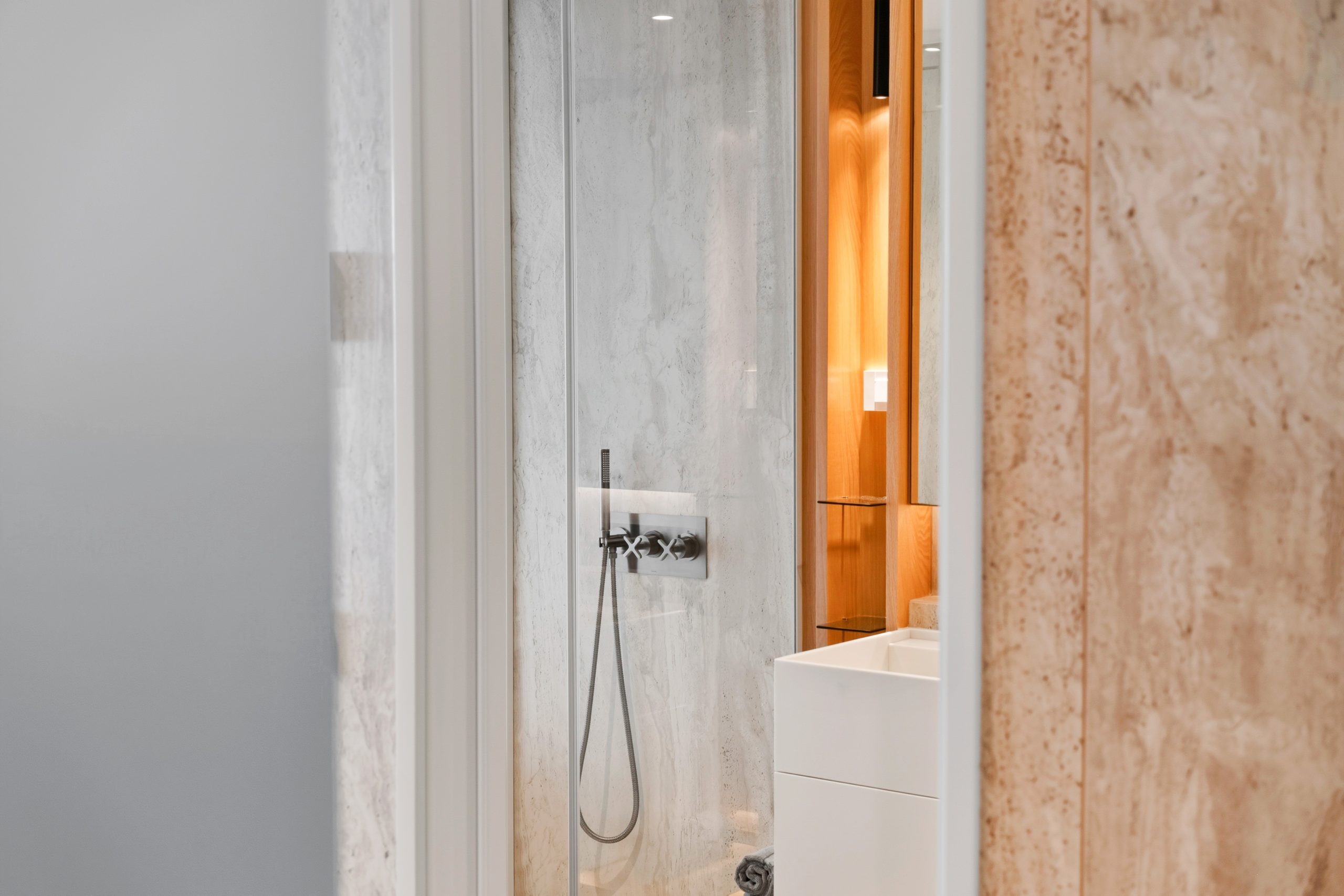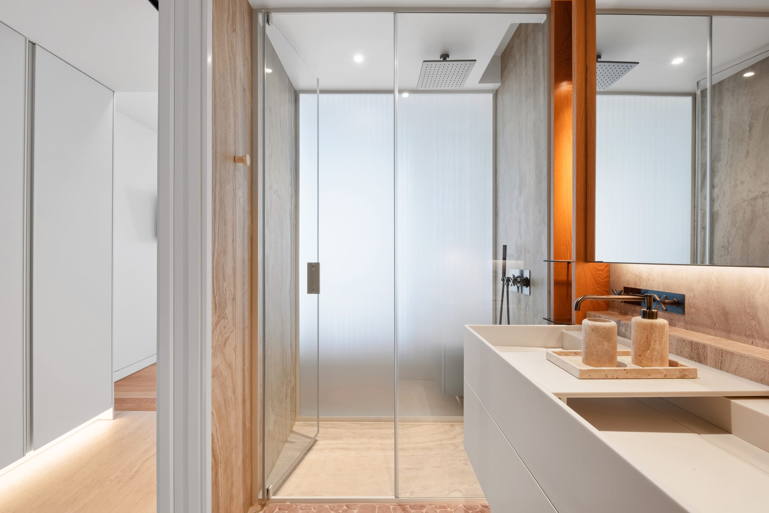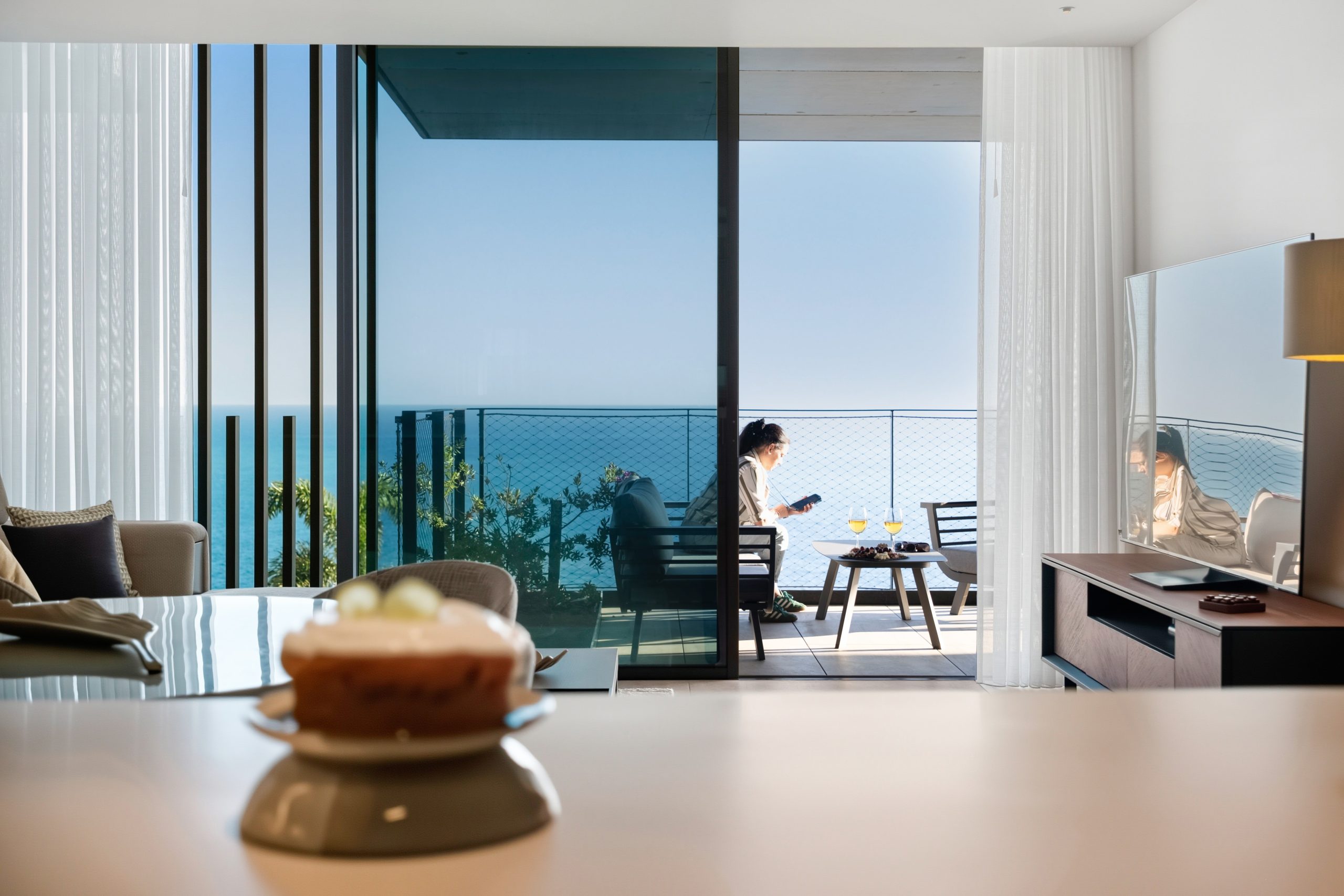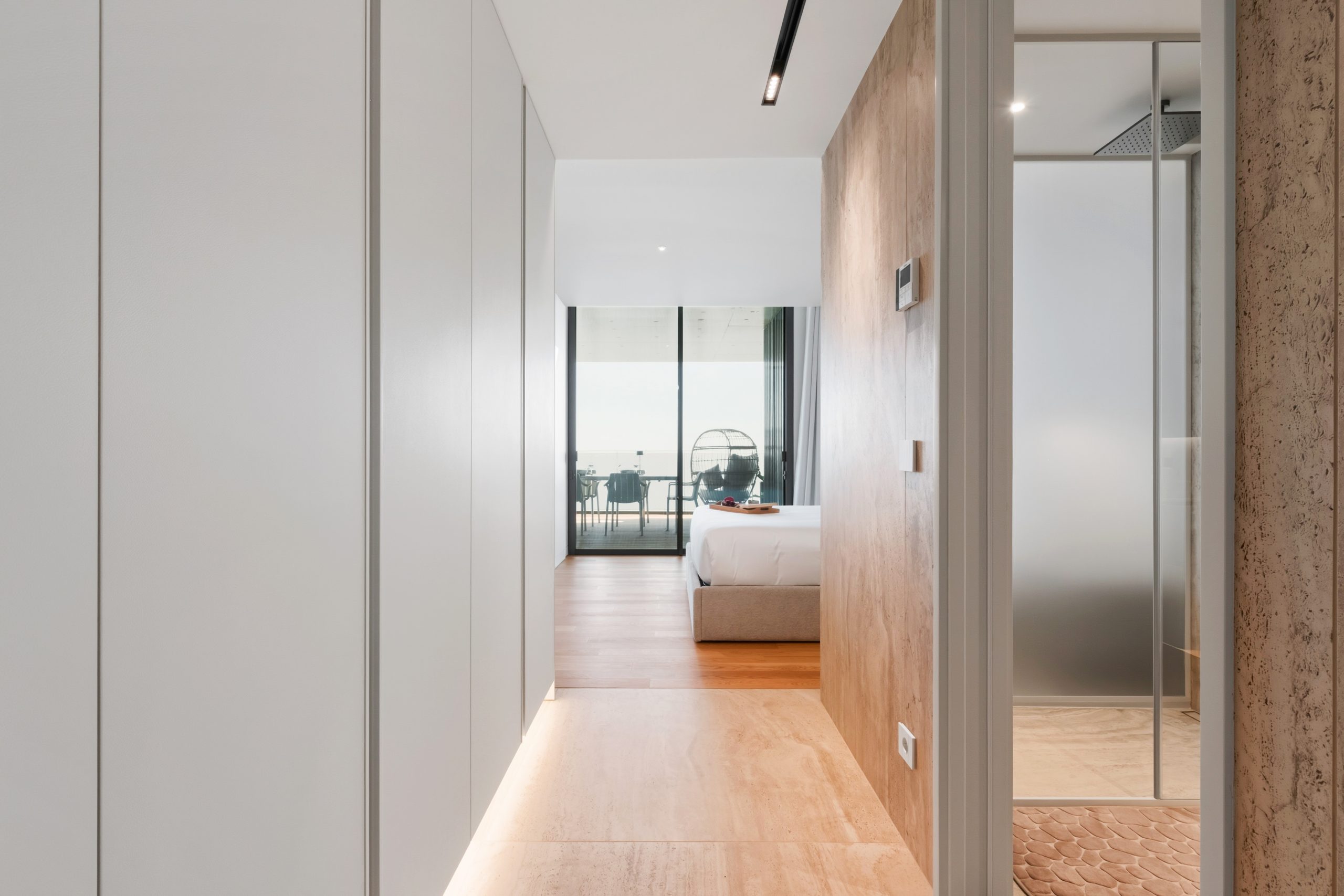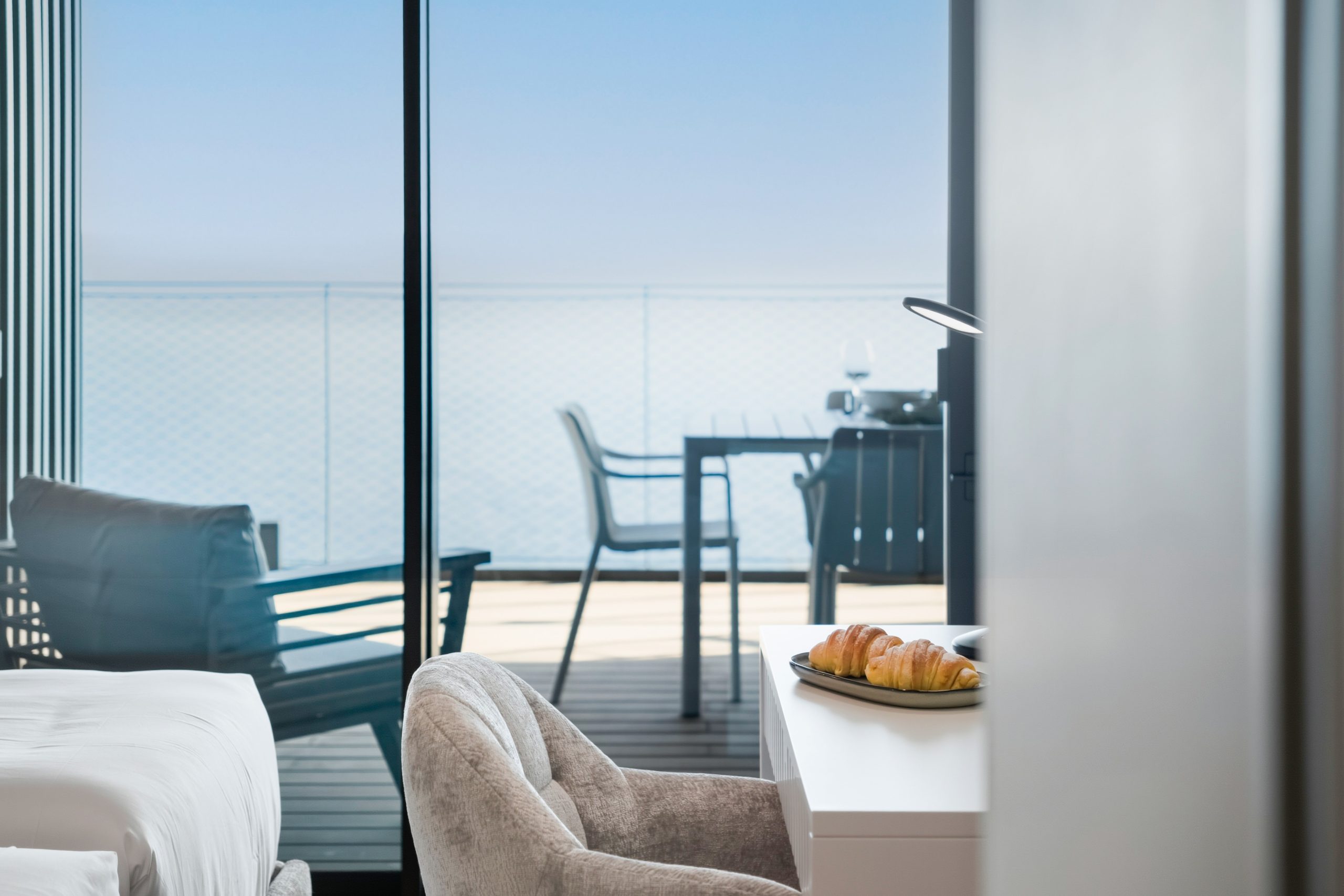 It features a spacious sea-view balcony with outdoor furniture, perfect for relaxing and enjoying leisure moments in the open air. The apartment offers two en-suite bedrooms: one with a king-size bed and television, and the other with two single beds and a practical desk, ideal for remote work or private online meetings. Both suites include private bathrooms with walk-in showers, ensuring maximum comfort and functionality.