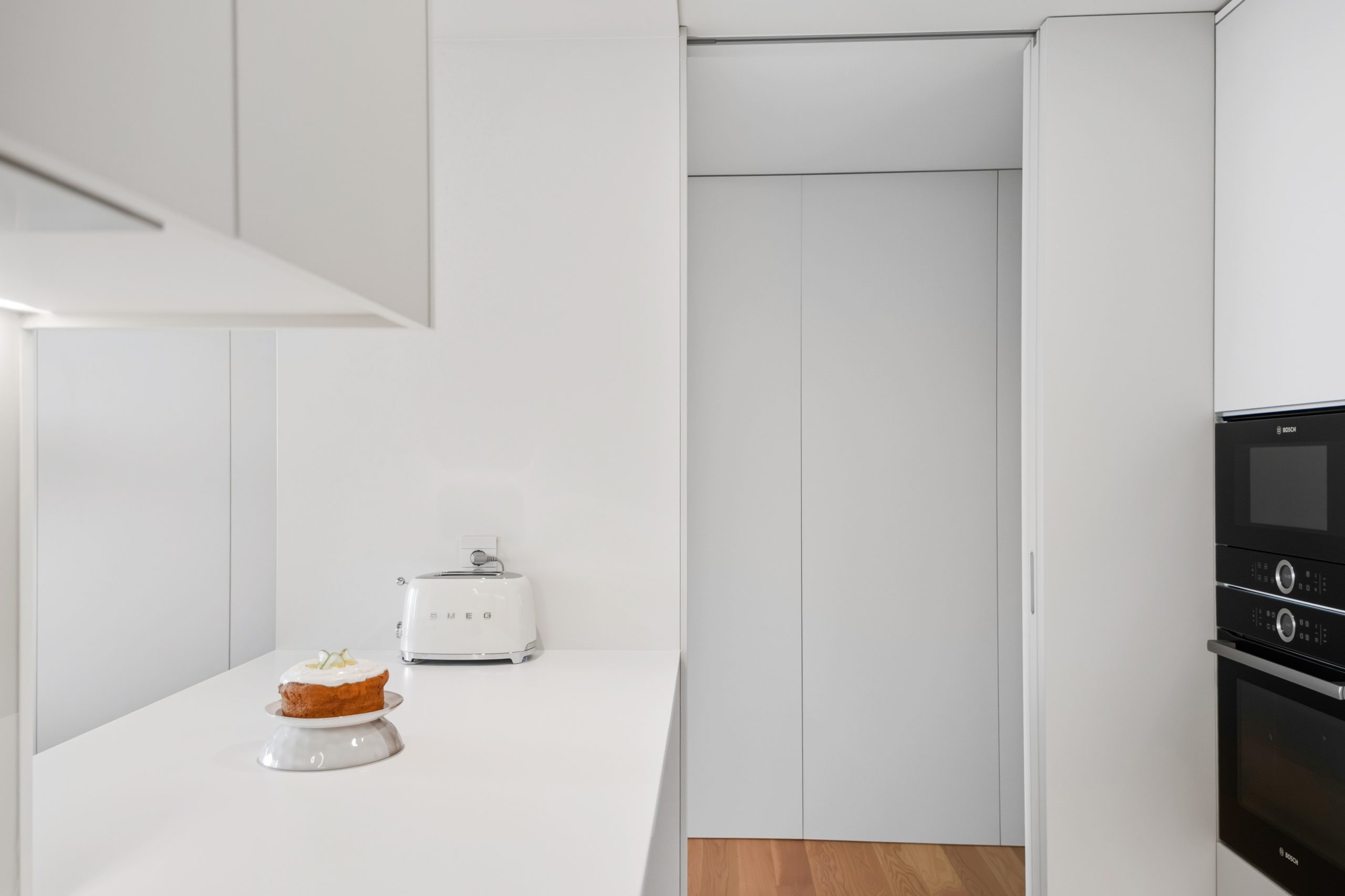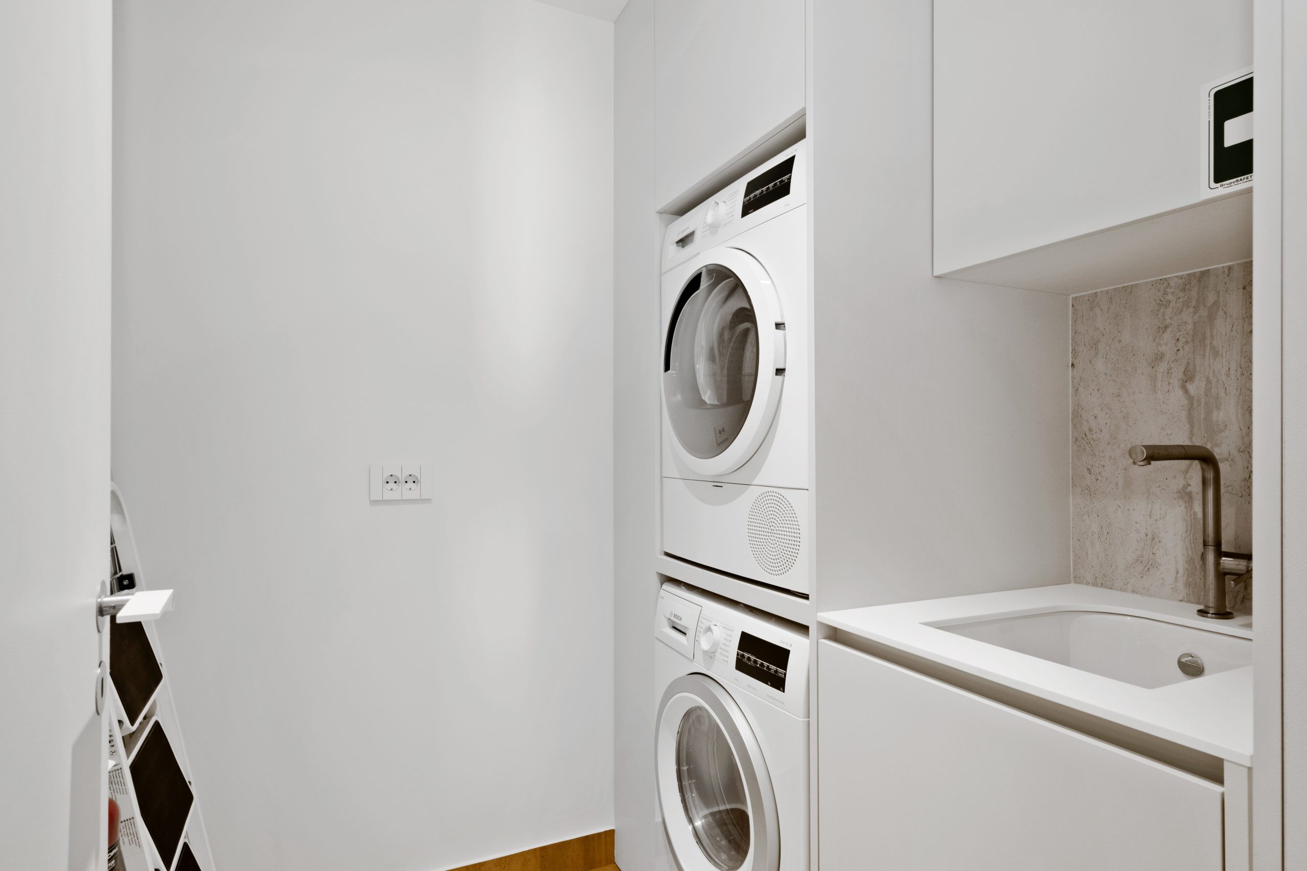 Adjacent to the kitchen, there is also a small laundry room fitted with all the necessary appliances to make you feel at home. Additionally, the apartment includes a guest bathroom serving the common areas.