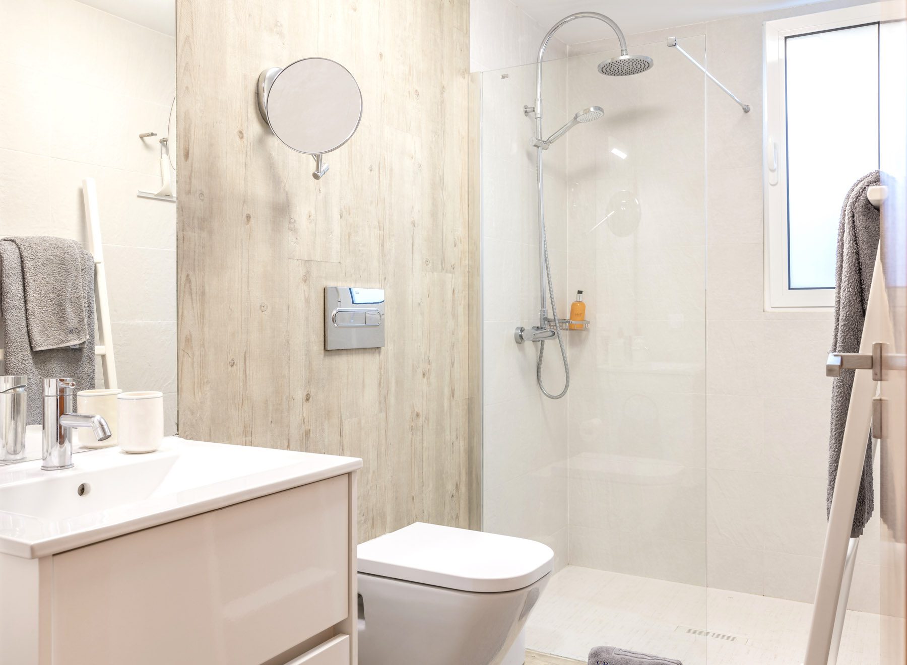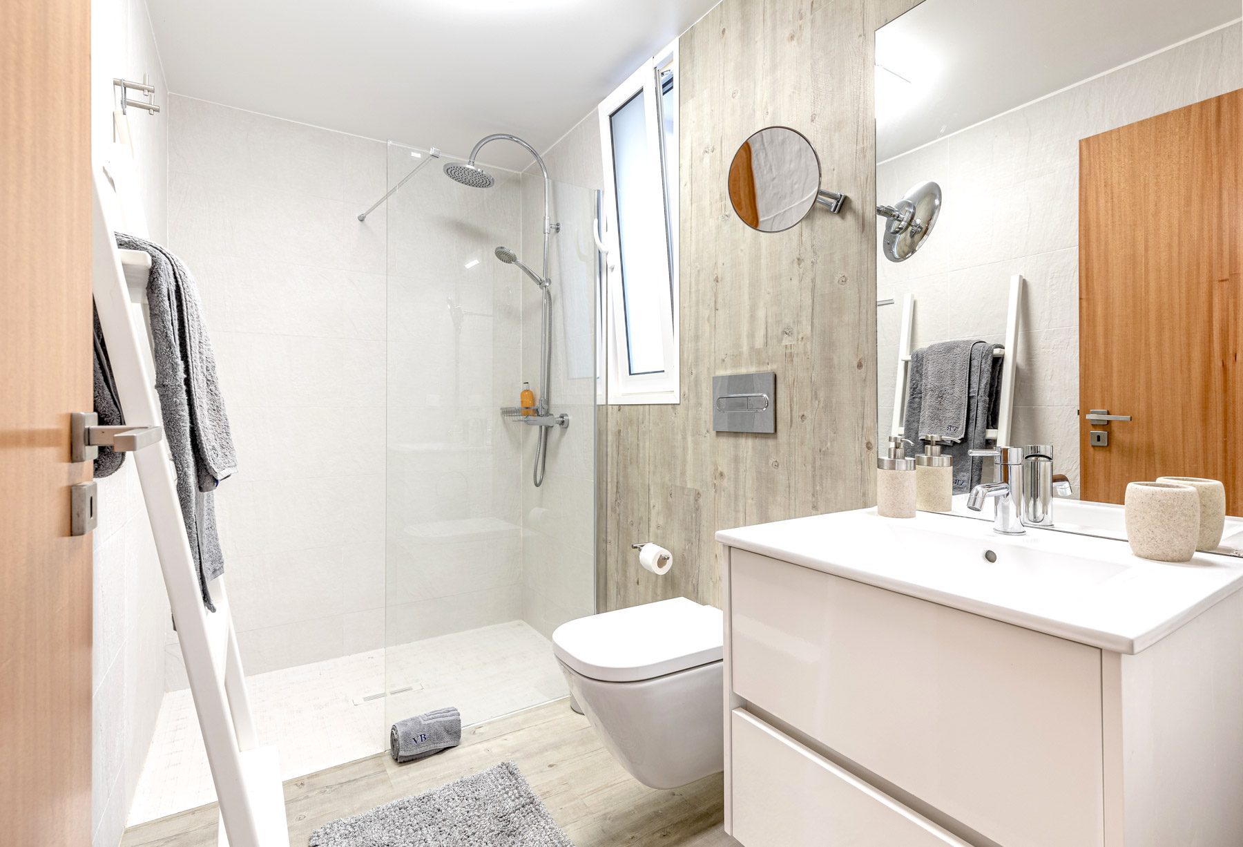 This holiday accommodation features a living room with a cosy and comfortable environment that invites relaxation and social moments. The two individual bathrooms ensure privacy and convenience, while the two bedrooms, one with a king-size bed (1.60×2.0m) and the other with three single beds, offer ample space to accommodate all guests comfortably.